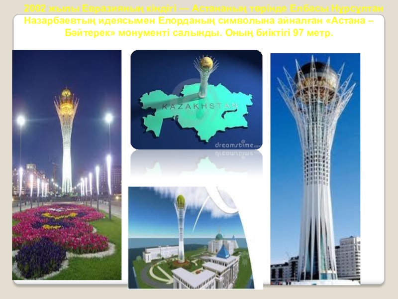Слайд 442002 жылы Евразияның кіндігі — Астананың төрінде Елбасы Нұрсұлтан Назарбаевтың идеясымен