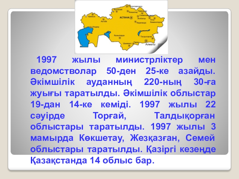Слайд 341997 жылы министрліктер мен ведомстволар 50-ден 25-ке азайды. Әкімшілік ауданның 220-ның