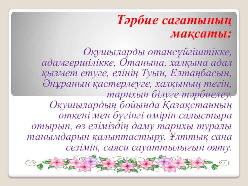 Оқушыларды отансүйгіштікке, адамгершілікке, Отанына, халқына адал қызмет етуге, елінің