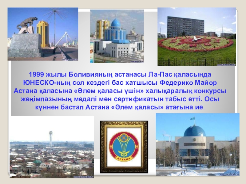 Федерико Майор Астана қаласына «Әлем қаласы үшін» халықаралық конкурсы жеңімпазының медалі мен сертификатын табыс етті. Осы күннен бастап Астана «Әлем қаласы» атағына ие.