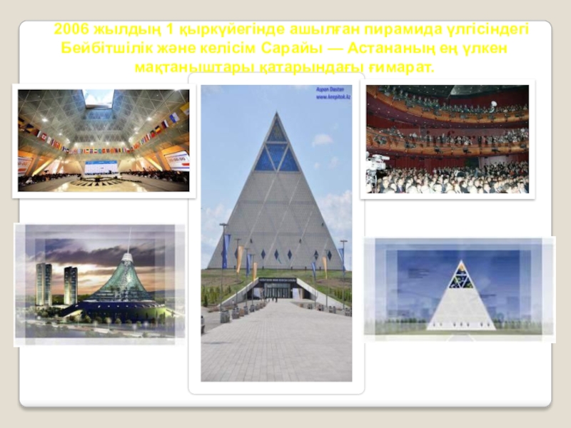 Слайд 522006 жылдың 1 қыркүйегінде ашылған пирамида үлгісіндегі Бейбітшілік және келісім Сарайы