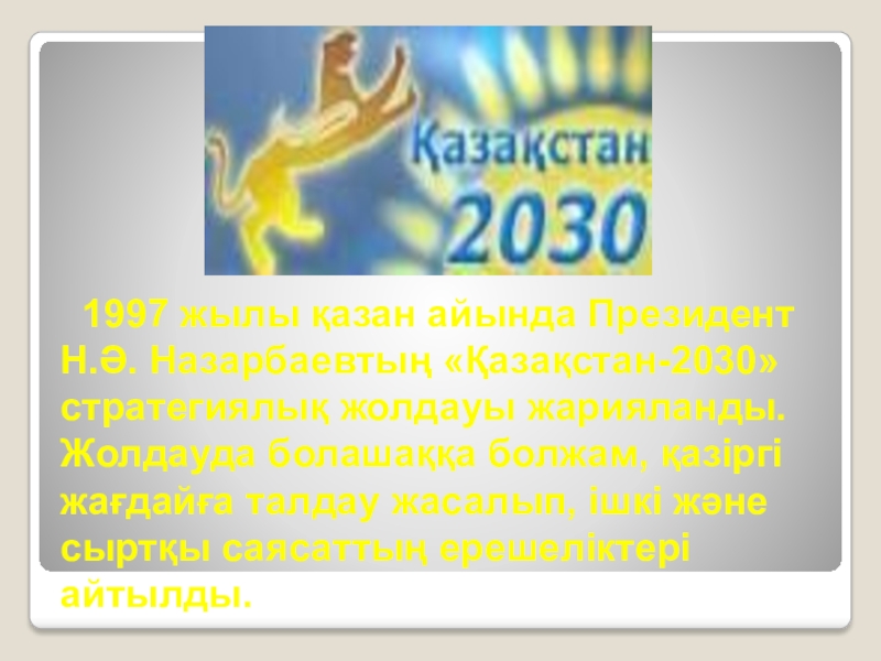 Слайд 351997 жылы қазан айында Президент Н.Ә. Назарбаевтың «Қазақстан-2030» стратегиялық жолдауы жарияланды.