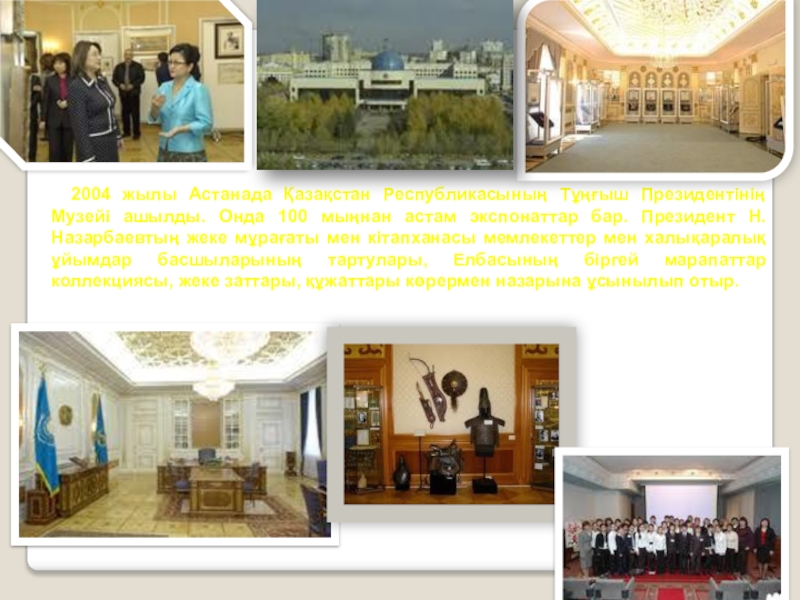 Слайд 492004 жылы Астанада Қазақстан Республикасының Тұңғыш Президентінің Музейі ашылды. Онда 100