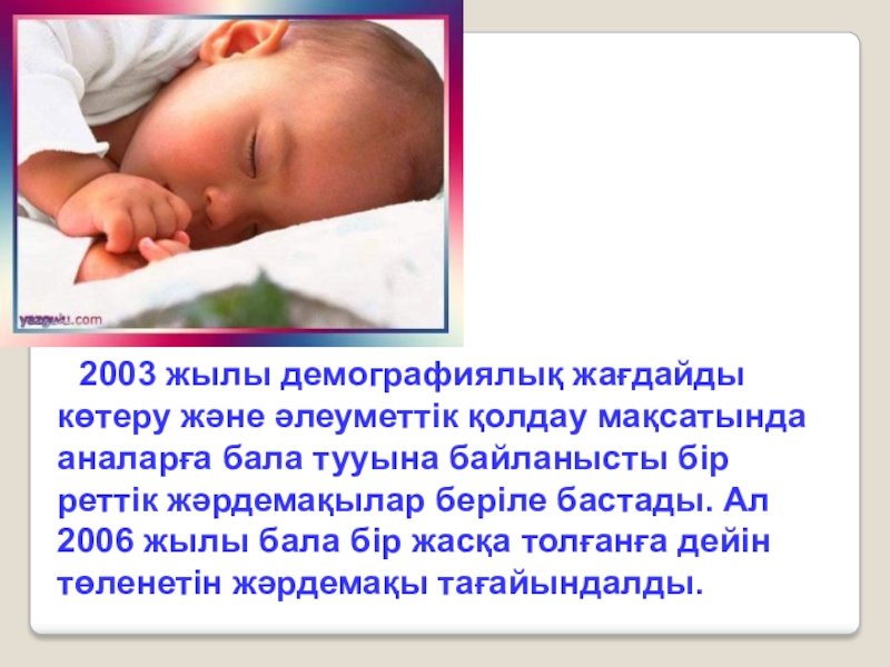 Слайд 472003 жылы демографиялық жағдайды көтеру және әлеуметтік қолдау мақсатында аналарға бала