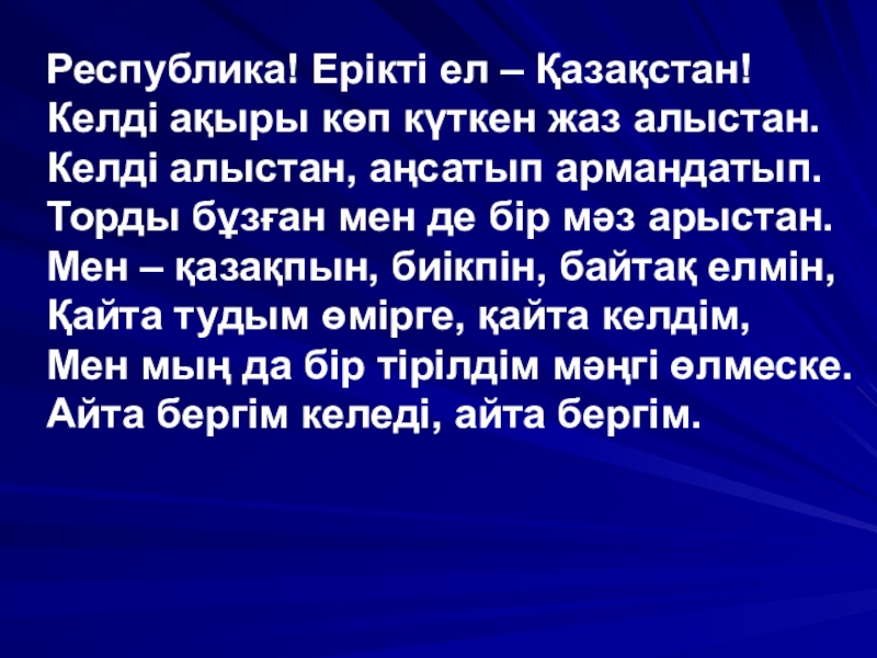 Республика! Ерікті ел – Қазақстан!Келді ақыры көп күткен жаз алыстан.Келді алыстан, аңсатып армандатып.Торды бұзған мен де бір