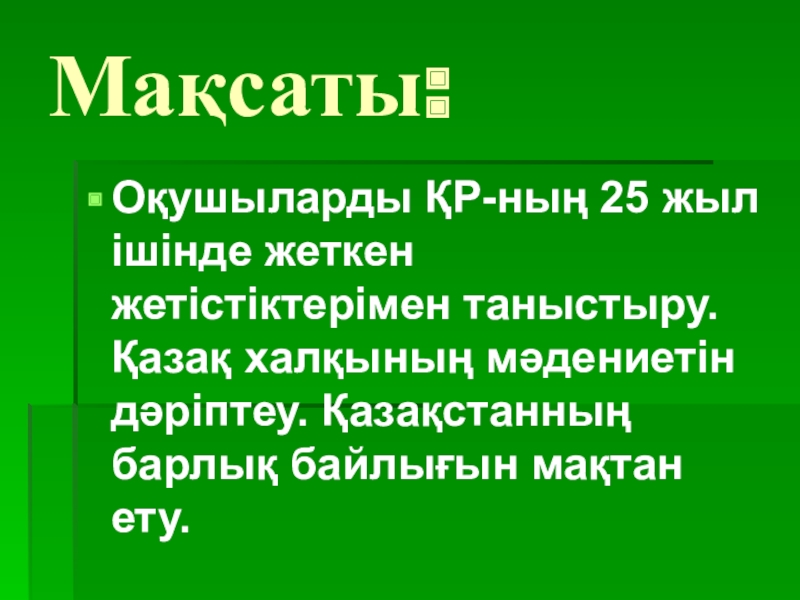 Мақсаты:Оқушыларды ҚР-ның 25 жыл ішінде жеткен жетістіктерімен таныстыру. Қазақ халқының мәдениетін дәріптеу. Қазақстанның барлық байлығын мақтан ету.