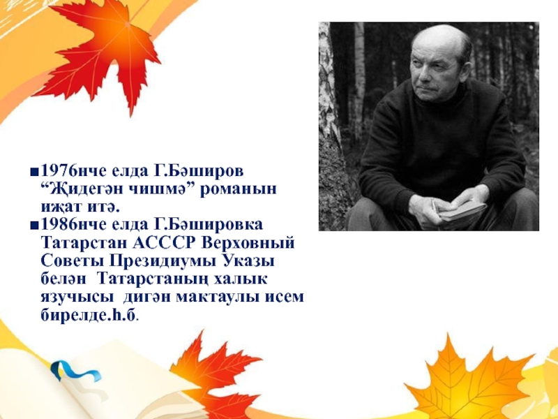 АСССР Верховный Советы Президиумы Указы белән Татарстаның халык язучысы дигән мактаулы исем бирелде.һ.б.