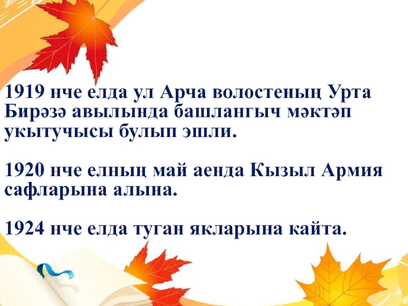 1919 нче елда ул Арча волостеның Урта Бирәзә авылында башлангыч мәктәп