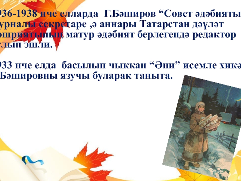 1936-1938 нче елларда Г.Бәширов “Совет әдәбияты” журналы секретаре ,ә аннары Татарстан