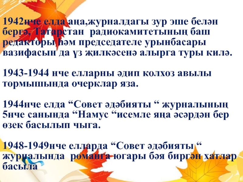 1942нче елда аңа,журналдагы зур эше белән бергә, Татарстан радиокамитетының баш редакторы