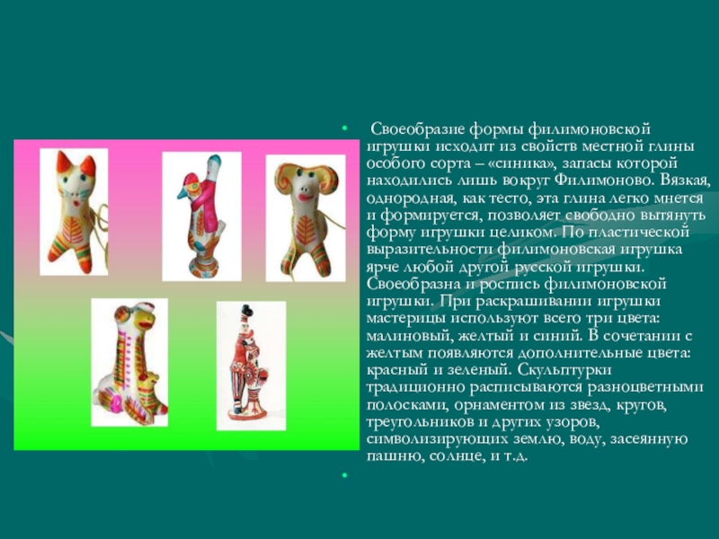 – «синика», запасы которой находились лишь вокруг Филимоново. Вязкая, однородная, как тесто, эта глина легко мнется и формируется, позволяет свободно вытянуть форму игрушки целиком. По пластической выразительности филимоновская игрушка ярче любой другой русской игрушки. Своеобразна и роспись филимоновской игрушки. При раскрашивании игрушки мастерицы используют всего три цвета: малиновый, желтый и синий. В сочетании с желтым появляются дополнительные цвета: красный и зеленый. Скульптурки традиционно расписываются разноцветными полосками, орнаментом из звезд, кругов, треугольников и других узоров, символизирующих землю, воду, засеянную пашню, солнце, и т.д.