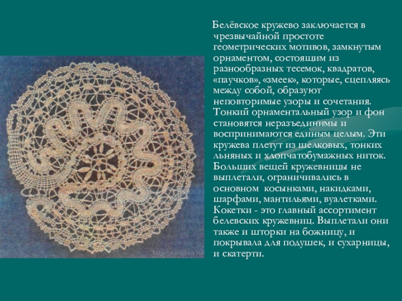 замкнутым орнаментом, состоящим из разнообразных тесемок, квадратов, «паучков», «змеек», которые, сцепляясь между собой, образуют неповторимые узоры и сочетания. Тонкий орнаментальный узор и фон становятся неразъединимы и воспринимаются единым целым. Эти кружева плетут из шелковых, тонких льняных и хлопчатобумажных ниток. Больших вещей кружевницы не выплетали, ограничивались в основном косынками, накидками, шарфами, мантильями, вуалетками. Кокетки - это главный ассортимент белевских кружевниц. Выплетали они также и шторки на божницу, и покрывала для подушек, и сухарницы, и скатерти.