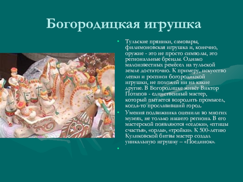 не просто символы, это региональные бренды. Однако малоизвестных ремёсел на тульской земле достаточно. К примеру, искусство лепки и росписи богородицкой игрушки, не похожей ни на какие другие. В Богородицке живёт Виктор Потапов - единственный мастер, который пытается возродить промысел, когда-то прославивший город.