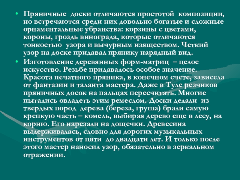 Изготовление деревянных форм-матриц – целое искусство. Резьбе придавалось особое значение. Красота печатного пряника, в конечном счете, зависела от фантазии и таланта мастера. Даже в Туле резчиков пряничных досок на пальцах пересчитать. Многие пытались овладеть этим ремеслом. Доски делали из твердых пород дерева (береза, груша) брали самую крепкую часть – комель, выбирая дерево еще в лесу, на корню. Его нарезали на дощечки. Древесина выдерживалась, словно для дорогих музыкальных инструментов от пяти до двадцати лет. И только после этого мастер наносил узор, обязательно в зеркальном отражении.