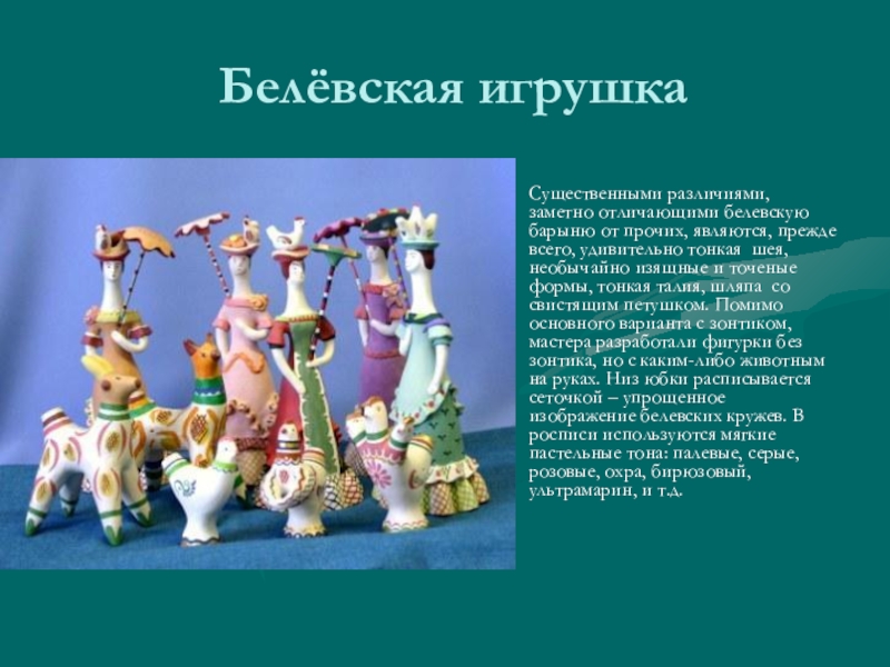 всего, удивительно тонкая шея, необычайно изящные и точеные формы, тонкая талия, шляпа со свистящим петушком. Помимо основного варианта с зонтиком, мастера разработали фигурки без зонтика, но с каким-либо животным на руках. Низ юбки расписывается сеточкой – упрощенное изображение белевских кружев. В росписи используются мягкие пастельные тона: палевые, серые, розовые, охра, бирюзовый, ультрамарин, и т.д.