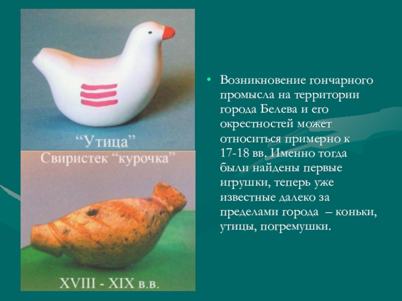 относиться примерно к 17-18 вв. Именно тогда были найдены первые игрушки, теперь уже известные далеко за пределами города – коньки, утицы, погремушки.