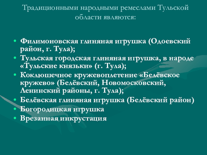 Слайд 2Традиционными народными ремеслами Тульской области являются: