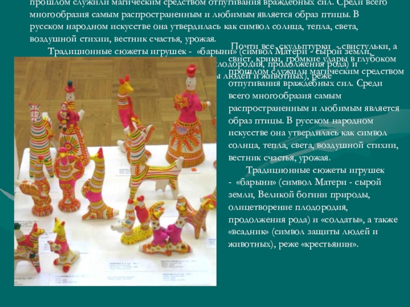 Почти все скульптурки - свистульки, а свист, крики, громкие удары в глубоком прошлом служили магическим средством отпугивания враждебных сил. Среди всего многообразия самым распространенным и любимым является образ птицы. В русском народном искусстве она утвердилась как символ солнца, тепла, света, воздушной стихии, вестник счастья, урожая.