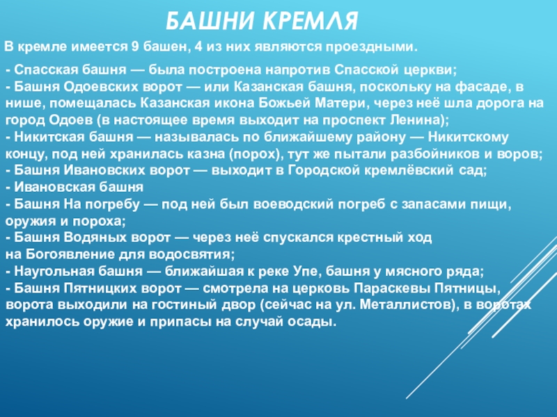 - Башня Ивановских ворот — выходит в Городской кремлёвский сад;