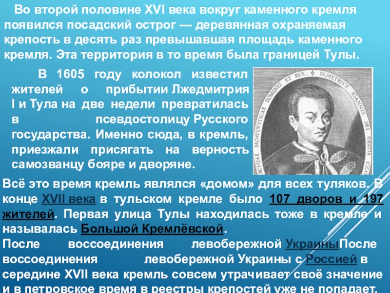 В 1605 году колокол известил жителей о прибытии Лжедмитрия I и Тула на две недели превратилась в псевдостолицу Русского государства. Именно сюда, в кремль, приезжали присягать на верность самозванцу бояре и дворяне.