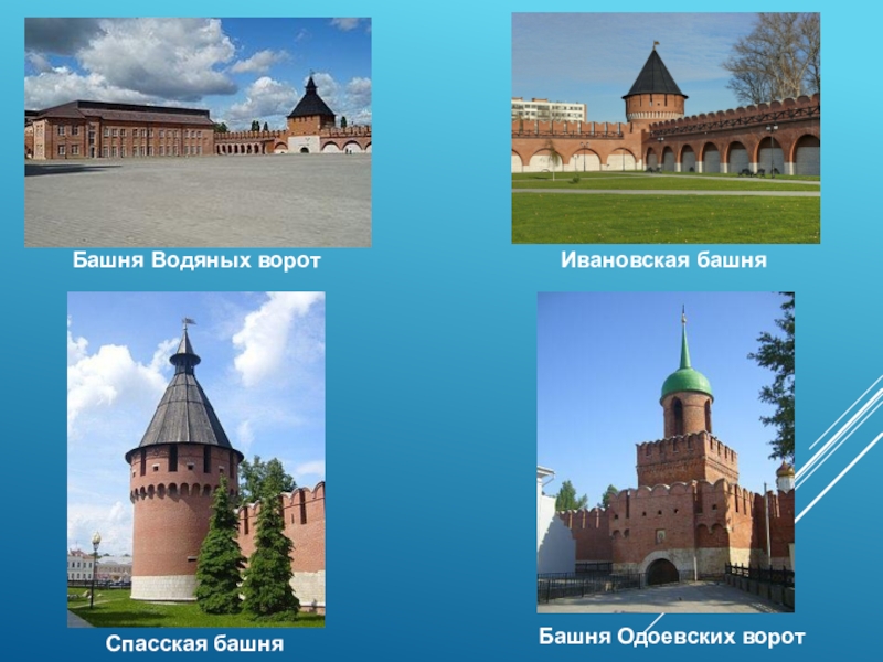 - Башня Одоевских ворот — или Казанская башня, поскольку на фасаде, в нише, помещалась Казанская икона Божьей Матери, через неё шла дорога на город Одоев (в настоящее время выходит на проспект Ленина);