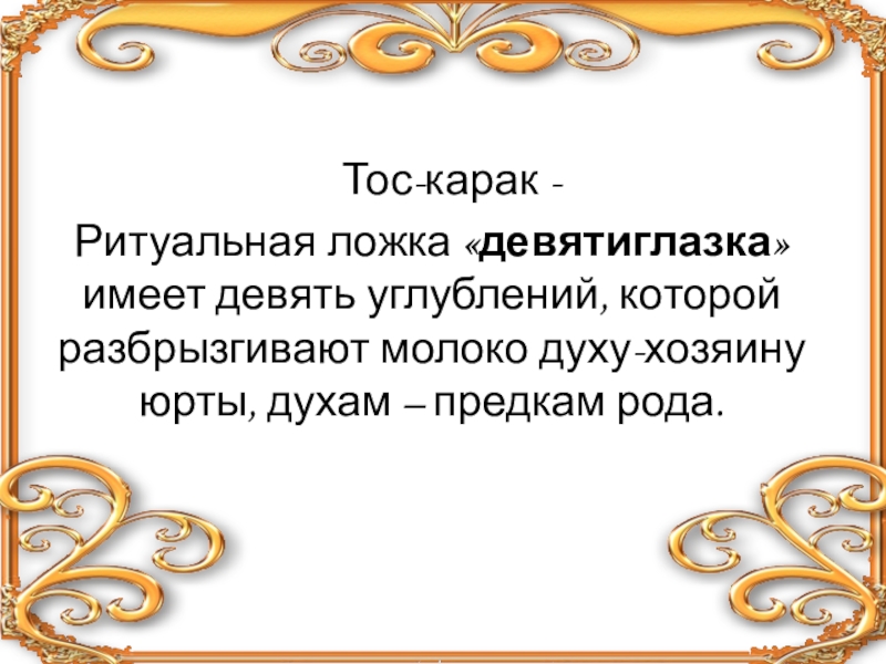 Тос-карак - Ритуальная ложка «девятиглазка» имеет девять углублений, которой разбрызгивают молоко духу-хозяину юрты, духам – предкам рода.