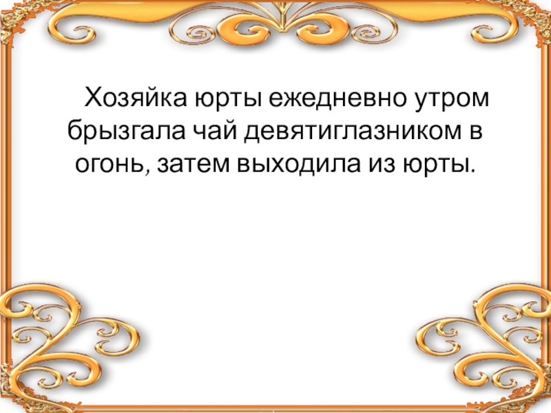 Хозяйка юрты ежедневно утром брызгала чай девятиглазником в огонь, затем выходила из юрты.