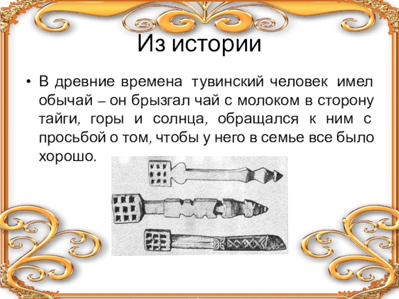 Из историиВ древние времена  тувинский человек  имел обычай – он брызгал чай с молоком в сторону тайги,