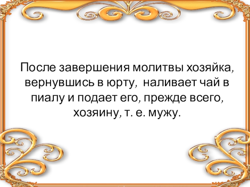После завершения молитвы хозяйка, вернувшись в юрту,  наливает чай в пиалу и подает его, прежде всего, хозяину,
