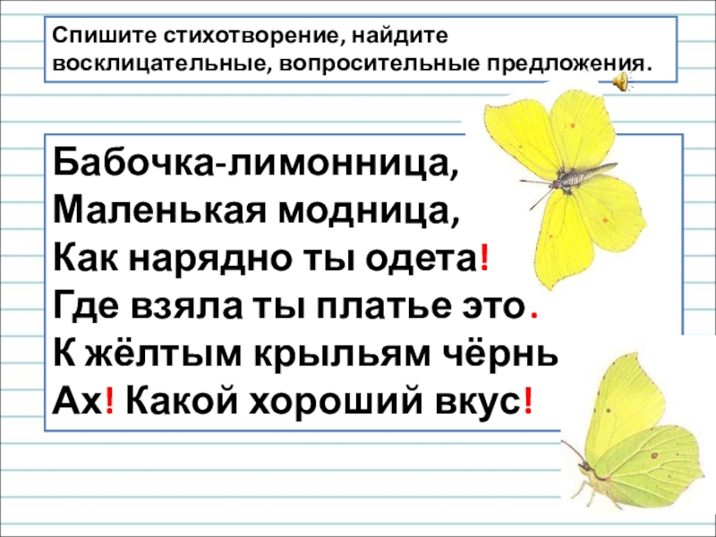 Спишите стихотворение, найдите восклицательные, вопросительные предложения.