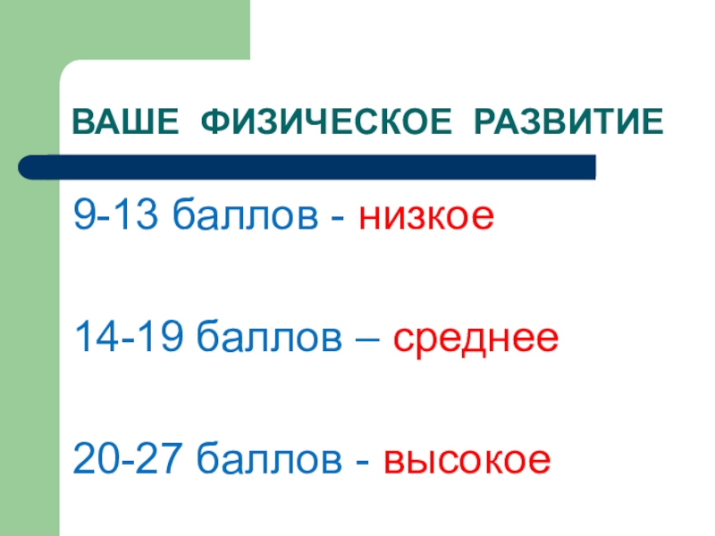 ВАШЕ ФИЗИЧЕСКОЕ РАЗВИТИЕ9-13 баллов - низкое14-19 баллов – среднее20-27 баллов - высокое