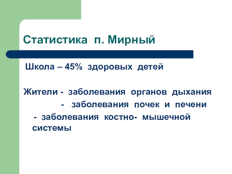 Статистика п. Мирный Школа – 45% здоровых детейЖители - заболевания органов дыхания