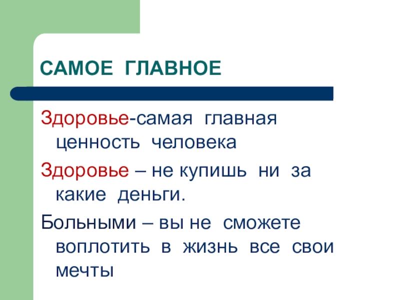 Здоровье-самая главная ценность человекаЗдоровье – не купишь ни за какие деньги.Больными – вы не сможете воплотить в