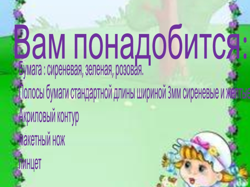 Вам понадобится:Бумага : сиреневая, зеленая, розовая.Полосы бумаги стандартной длины шириной 3мм сиреневые и желтые.Акриловый контур макетный нож