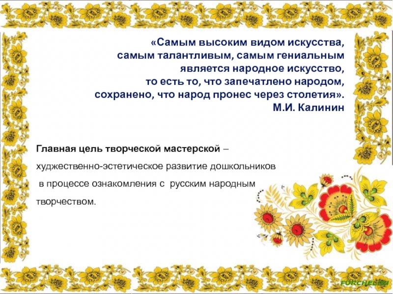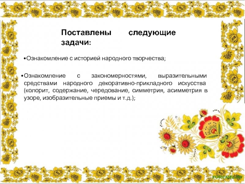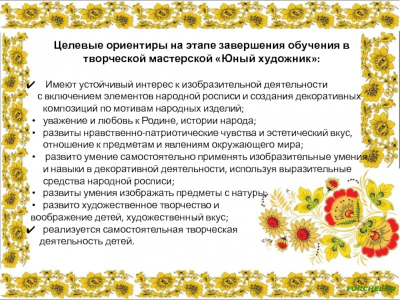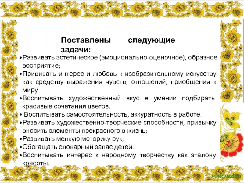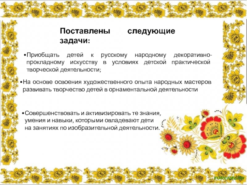 На основе освоения художественного опыта народных мастеров развивать творчество детей в орнаментальной деятельности