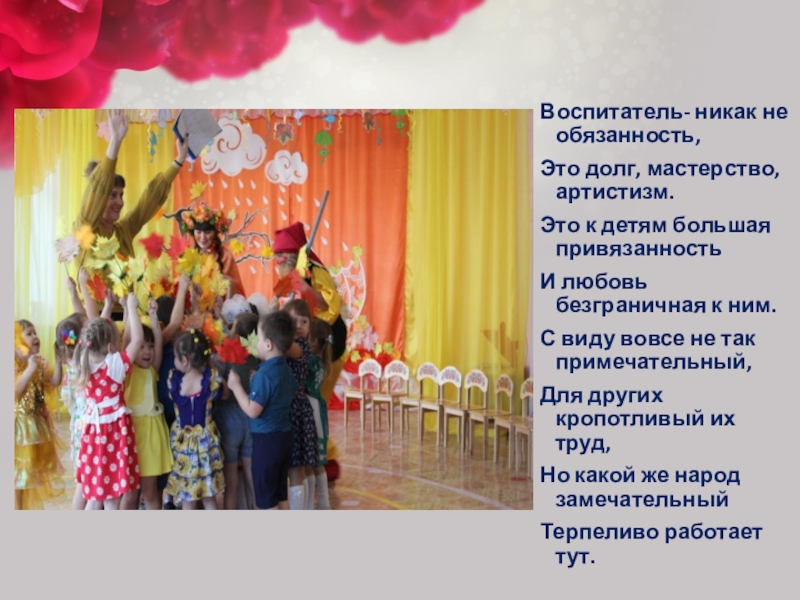 Воспитатель- никак не обязанность,Это долг, мастерство, артистизм.Это к детям большая привязанность И любовь безграничная к ним.С виду