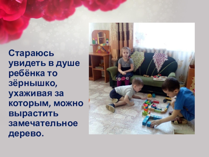 Слайд 23Стараюсь увидеть в душе ребёнка то зёрнышко, ухаживая за которым, можно
