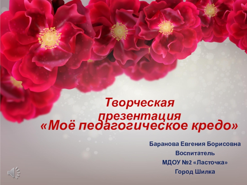 «Моё педагогическое кредо»Баранова Евгения БорисовнаВоспитательМДОУ №2 «Ласточка»Город ШилкаТворческая презентация