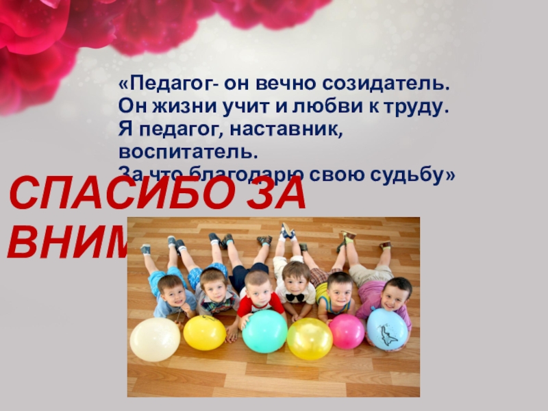 «Педагог- он вечно созидатель.Он жизни учит и любви к труду.Я педагог, наставник, воспитатель.За что благодарю свою судьбу»СПАСИБО