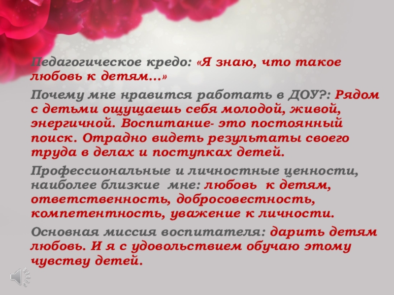 Слайд 4Педагогическое кредо: «Я знаю, что такое любовь к детям…»