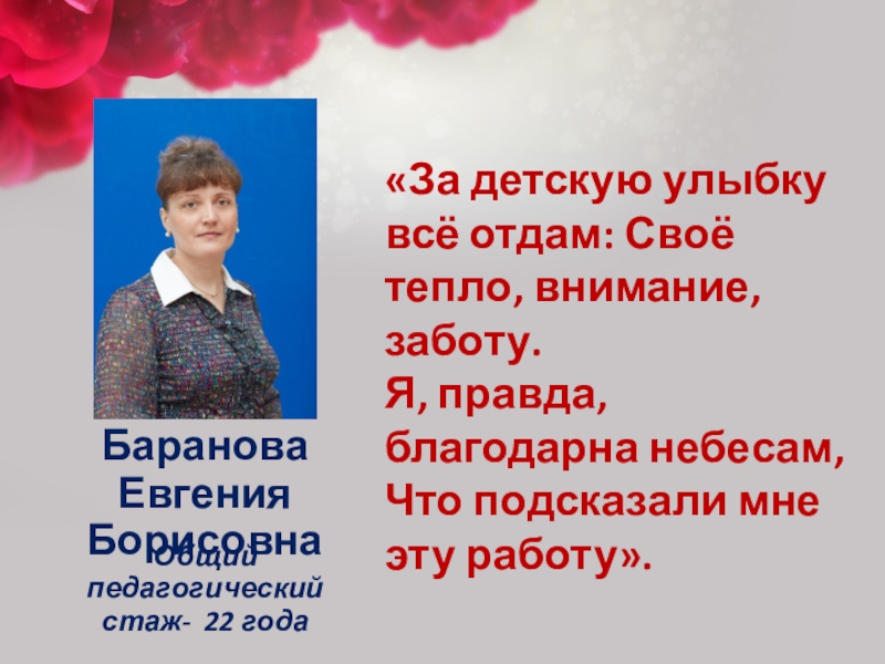 Баранова Евгения Борисовна Общий педагогический стаж- 22 года«За детскую улыбку всё отдам: Своё тепло, внимание, заботу. Я,
