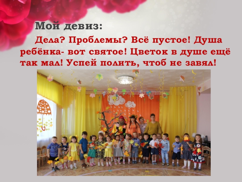 Мой девиз:   Дела? Проблемы? Всё пустое! Душа ребёнка- вот святое! Цветок в душе