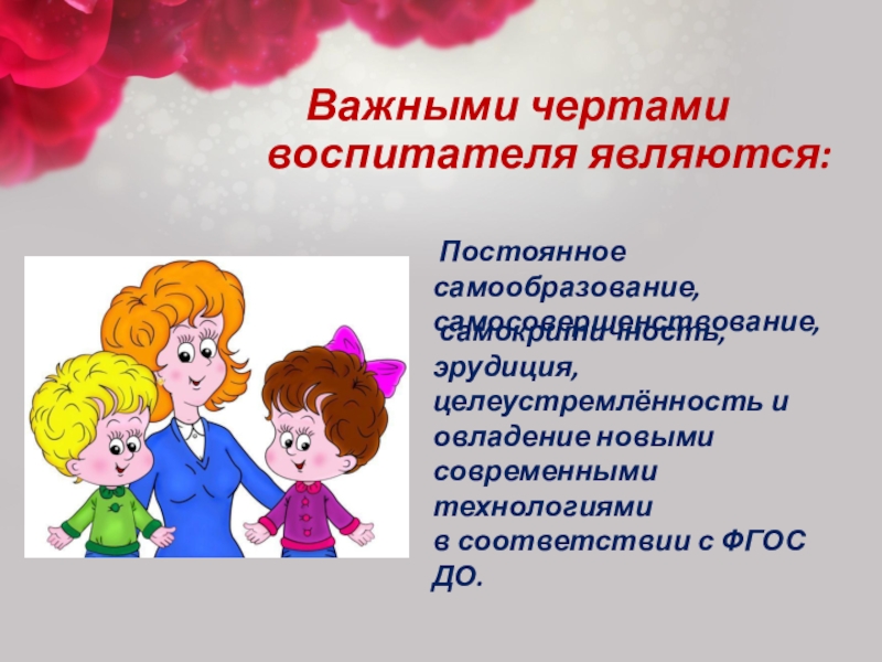 Важными чертами воспитателя являются:    Постоянное самообразование, самосовершенствование,   самокритичность, эрудиция, целеустремлённость
