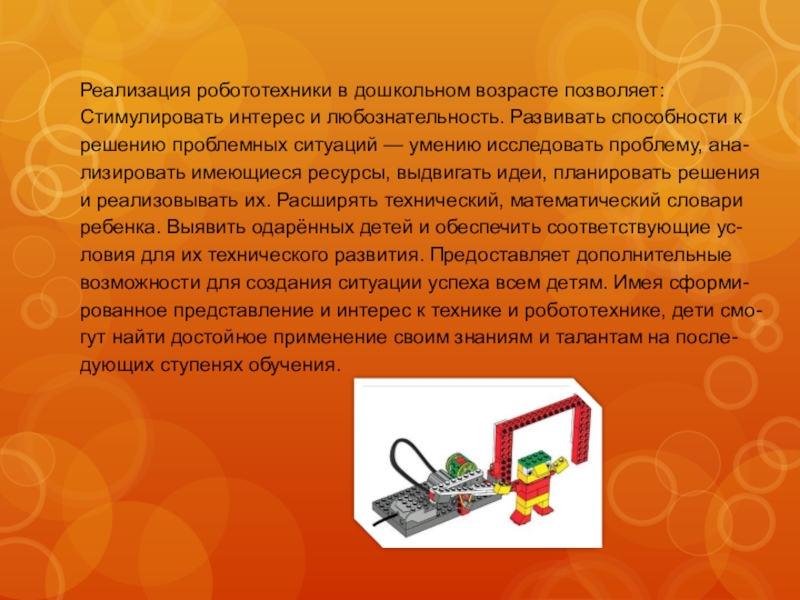 Реализация робототехники в дошкольном возрасте позволяет: Стимулировать интерес и любознательность. Развивать
