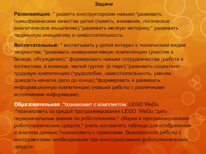 Образовательная :*познакомит с комплектом LEGO WeDо ;*познакомить со средой программирования LEGO WeDо;*дать первоначальные знания по робототехнике;* сборки и программирования робототехнических средств;* учить составлять таблицы для отображения и анализа данных;*познакомить с правилами безопасности работы с инструментами необходимыми при конструировании робототехнических средств.
