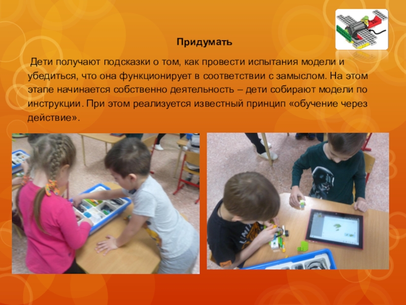 и убедиться, что она функционирует в соответствии с замыслом. На этом этапе начинается собственно деятельность – дети собирают модели по инструкции. При этом реализуется известный принцип «обучение через действие».