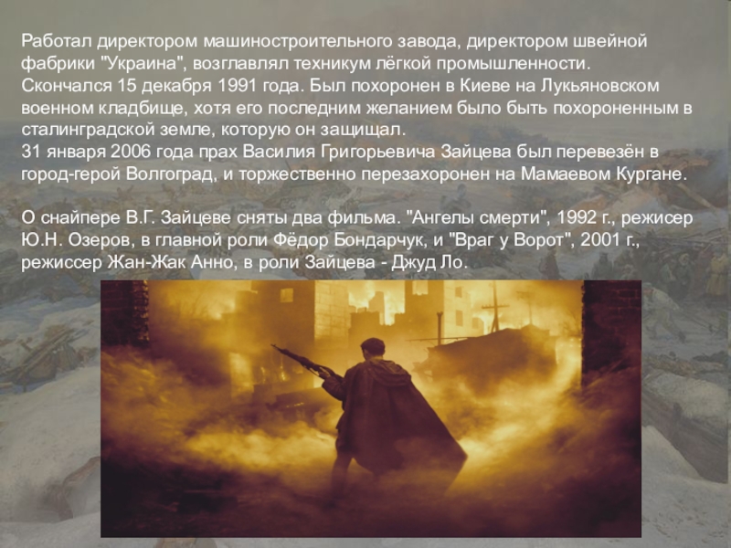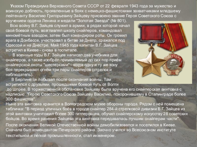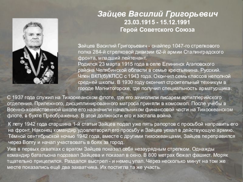 Зайцев Василий Григорьевич - снайпер 1047-го стрелкового полка 284-й стрелковой дивизии 62-й армии Сталинградского фронта, младший лейтенант.