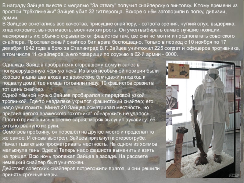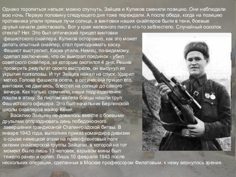 Осмотрев пробоину, он перешёл на другое место и проделал то же самое. И снова выстрел. Зайцев прильнул к стереотрубе. Начал тщательно просматривать местность. На одном из холмов мелькнула тень. Здесь! Теперь надо фашиста выманить и взять на прицел. Всю ночь пролежал Зайцев в засаде. На рассвете немецкий снайпер был уничтожен.