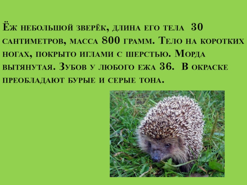 Ёж небольшой зверёк, длина его тела 30 сантиметров, масса 800 грамм. Тело на коротких ногах, покрыто иглами