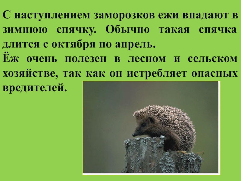 С наступлением заморозков ежи впадают в зимнюю спячку. Обычно такая спячка длится с октября по апрель.Ёж очень